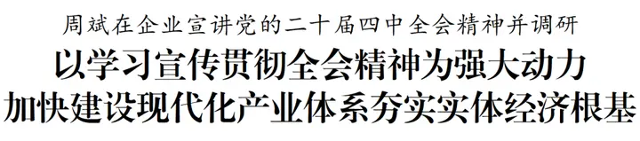 10月30日,市委书记周斌到企业宣讲党的二十届四中全会精神并调研重大项目建设情况。他强调,要认真学习宣传贯彻党的二十届四中全会精神,自觉把思想和行动统一到习近平总书记重要讲话精神和全会部署上来,锚定坚决实现全年经济社会发展目标,推动重大项目提速提质提效,加快建设现代化产业体系,夯实实体经济根基,为高质量发展注入强劲动能。