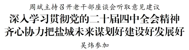 11月5日,市委书记周斌主持召开老干部座谈会,深入学习贯彻党的二十届四中全会精神,就推动我市“十五五”时期发展听取意见建议,共同把盐城未来谋划好、建设好、发展好。市委副书记吴炜参加。