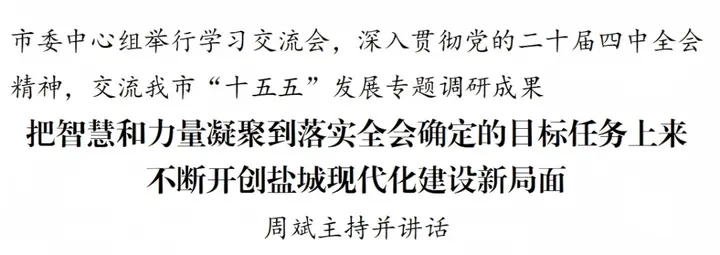 周斌指出,学习好宣传好贯彻好党的二十届四中全会精神,是当前和今后一个时期的重要政治任务。要把坚持党的领导作为根本保证,将党的领导嵌入经济社会发展规划、设计、执行、评估全流程,充分调动全社会投身中国式现代化建设的积极性主动性创造性。要把坚持学深悟透作为首要前提,深刻理解和把握全会提出的形势判断、工作要求、战略部署,在对标对表中把准方向,在融会贯通中把握要义,在一体落实中见到实效,推动实现发展能级、发展质效、发展后劲整体提升。要把坚持科学谋划作为关键举措,深入研究中央重大战略部署,全面落实省委部署要求,结合盐城工作实际,谋划一批重点改革、重要事项、重大项目纳入上位规划,做到彰显城市优势、形成发展特色。要把坚持抓好当前作为实践抓手,对照年初确定的目标任务,狠抓落实、强化调度,全力做好稳就业、稳企业、稳市场、稳预期等重点工作,着力保障和改善民生,更好统筹发展和安全,确保“十四五”收好官、“十五五”开好局。