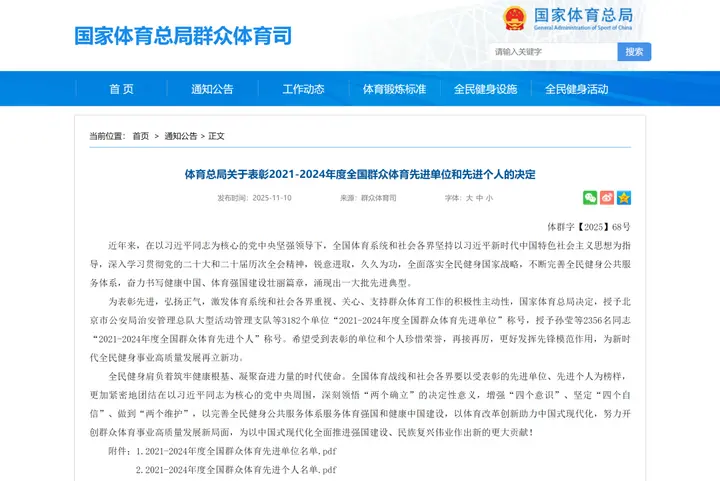 11月9日,全国群众体育先进单位先进个人、全国体育系统先进集体先进个人表彰大会在广州召开。会上宣读了全国体育系统先进表彰决定、全国群众体育先进表彰决定。