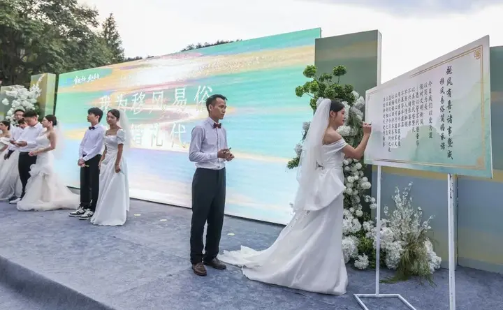 2025年8月20日,在浙江省诸暨市东白湖镇斯宅村举行的集体婚礼上,新人在移风易俗倡议上签名。新华社记者徐昱摄