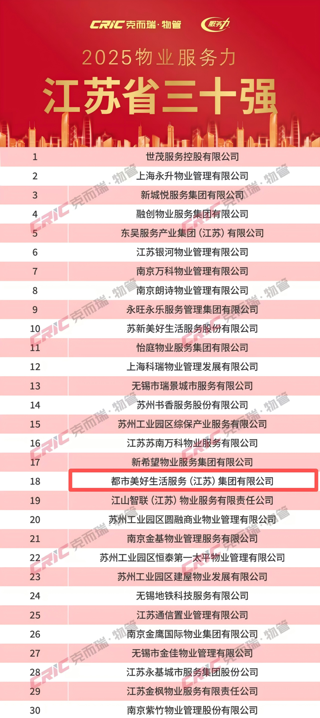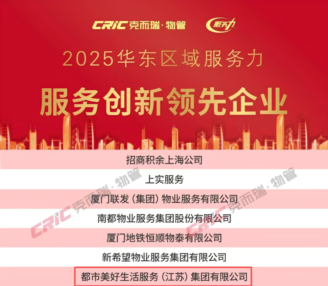 11月20日,克而瑞物管正式发布「2025年华东区域物业服务力系列研究成果」。都市美好生活服务(江苏)集团有限公司凭借扎实的服务功底、卓越的综合实力与深厚的市场积淀,一举斩获多项殊荣——荣登“2025物业服务力江苏省三十强”第十八名,并获评“2025华东区域服务力服务创新领先企业”。