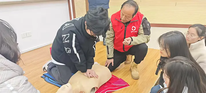 “同学们,心脏急症是导致心脏骤停的最常见原因,电击、淹溺等意外伤害也可能引发呼吸、心脏骤停。一旦发现有人心脏骤停,必须争分夺秒开展现场心肺复苏,才有可能挽救生命。”培训师陆仁平强调道。他详细拆解了高质量心肺复苏的核心标准:成人按压频率需保持在每分钟100至120次,按压深度达5至6厘米,每次按压后胸廓需完全恢复,按压与放松时间大致相等,同时要尽量避免按压中断,且人工呼吸时需避免过度用气。