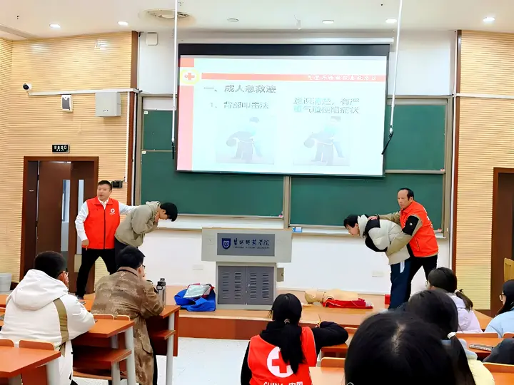 培训师通过PPT系统讲解了红十字运动基本知识、心肺复苏操作流程、气道异物梗阻急救、AED使用规范等理论内容。授课过程中,培训师引用典型案例,以寓教于乐的方式,让同学们在轻松氛围中吸收新知识、掌握新技能。