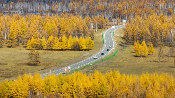 2025年9月29日,游客在内蒙古阿尔山国家森林公园驾车游玩(无人机照片)。新华社记者 贝赫 摄