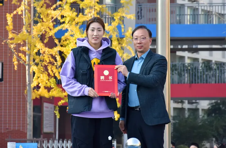 仪式上,盐城市日月路小学党支部书记、校长赵志宏为彭诗梦颁发了“体育荣誉校长”聘书,以此感谢她对母校教育事业的关心与支持,希望她能成为更多学子追逐梦想的精神指引;彭诗梦的小学班主任王建营老师分享了她在日月路小学时的成长故事,那些关于执着训练、勤奋求学的点滴往事,让在场师生深刻感受到榜样成功背后的坚持与付出。