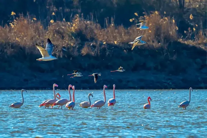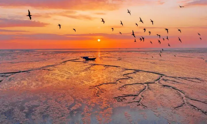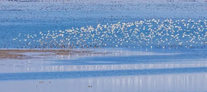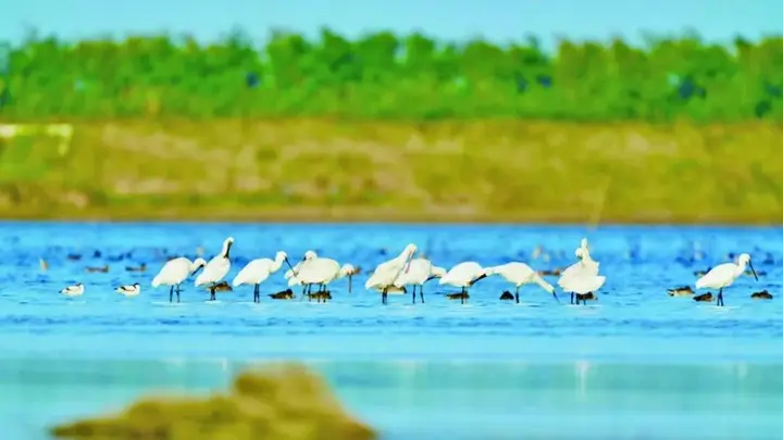 这里是世界上面积最大的潮间带湿地,也是全球最重要的滨海湿地生态系统之一,还拥有国内第一块固定高潮位候鸟栖息地“720高地”。勺嘴鹬、小青脚鹬等濒危物种在这里补充能量准备南迁,东方白鹳、火烈鸟、卷羽鹈鹕在这里悠然过冬……退潮后的滩涂上,鸟群密密麻麻,堪称“鸟类联合国大会”。