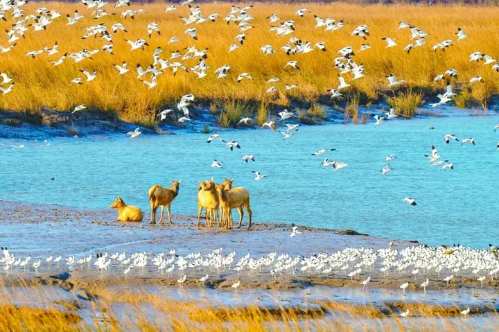 野鹿荡位于大丰区,是一处面积达200公顷的滨海湿地,是地球上保存较为完好的原始湿地之一。在这里不仅可以看到麋鹿奔跑嬉戏的景象,还可以观测到东方白鹳、黑脸琵鹭、绿头鸭、普通鸬鹚等鸟类。鸥水相依、鹿鸣呦呦,鸟鹿和谐的梦幻场景,令人神往。
