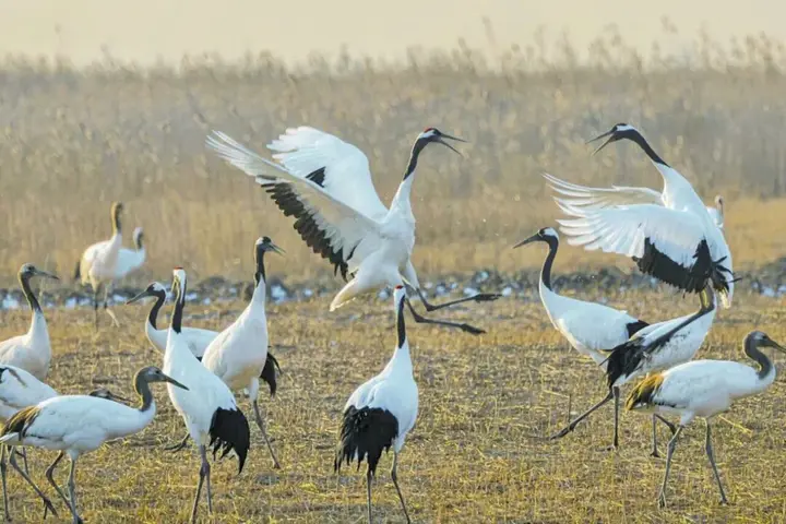 这片湿地环境优越,为丹顶鹤营造了理想的生态家园。除了丹顶鹤,在这里还能邂逅白天鹅、黑天鹅、鹈鹕、鸳鸯等多种鸟类。景区内的丹顶鹤救助繁育中心更是一大亮点,置身其间,能欣赏到群鹤振翅冲霄、“一举扶摇直上天”的震撼场景。