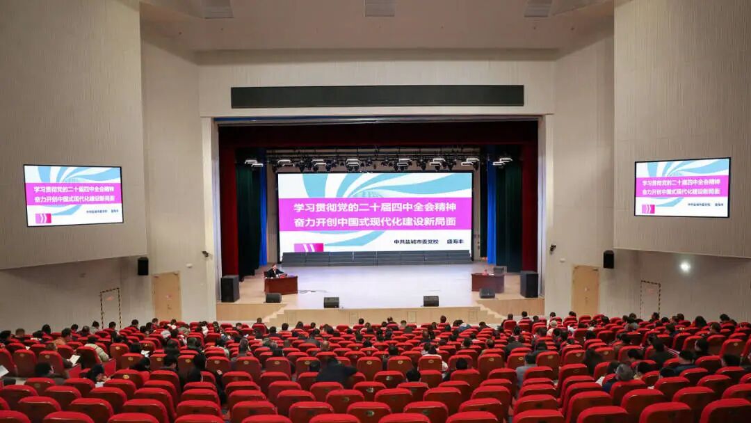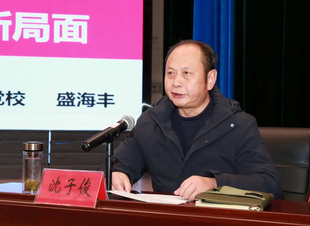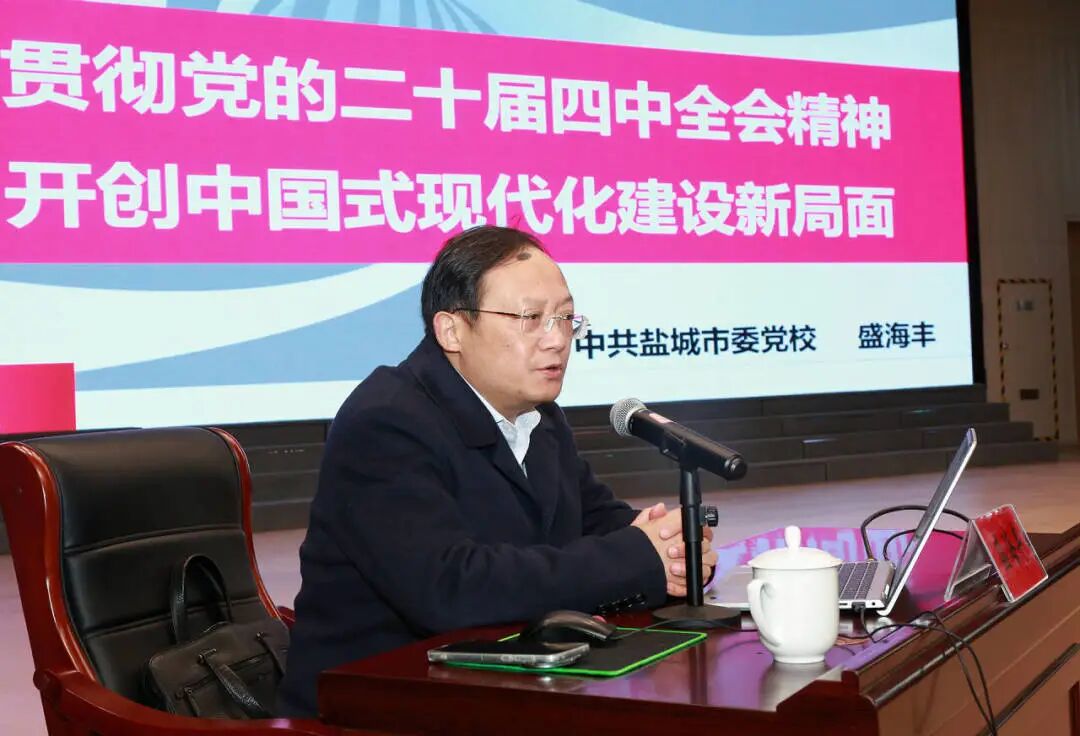 为深入学习贯彻党的二十届四中全会精神,切实把思想和行动统一到党中央决策部署上来,12月6日,盐城市经贸高级职业学校特邀盐城市委党校副校长、盐城市人大常委会委员、江苏团省委讲师团成员盛海丰同志来校,为全校教职工作题为《学习贯彻党的二十届四中全会精神 奋力开创中国式现代化建设新局面》的专题辅导报告。校党委书记沈子俊主持报告会。