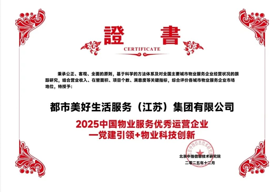 12月11日,房地产行业研究领域权威标杆机构中指研究院,在2025中国房地产大数据年会暨2026中国房地产市场趋势报告会上,正式发布《2025主要区域、省市物业服务市场地位领先企业及标杆项目》研究成果。都市美好生活服务(江苏)集团有限公司(以下简称“都市美好服务集团”)凭借鲜明的党建引领特色、创新的服务模式与卓越的运营实力,成功获评“中国物业服务优秀运营企业”,其“党建引领+物业科技创新”融合发展模式获行业高度认可。
