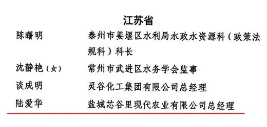近日,水利部2025年中国节水奖评选表彰结果出炉,盐城芯谷里现代农业有限公司总经理陆爱华荣获中国节水奖先进个人称号,系盐城唯一。