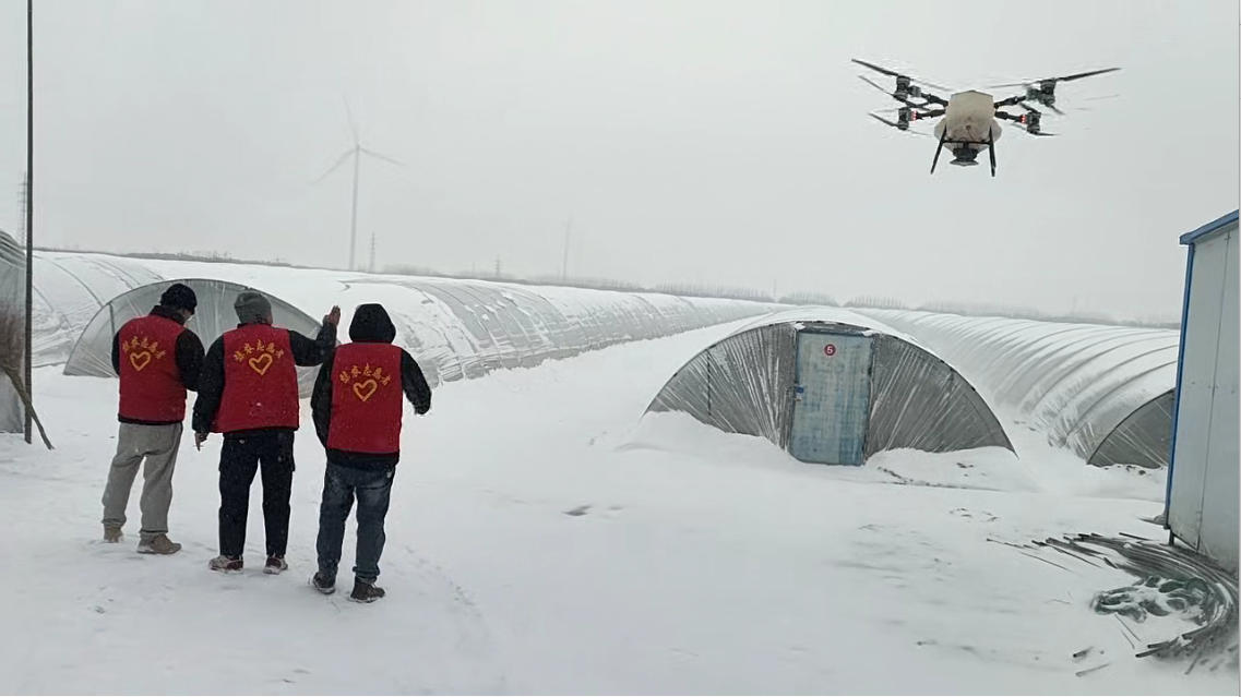 “大棚骨架承重有限,积雪厚度每增加1厘米,风险就多一分,轻则压弯骨架,重则棚膜破裂、秧苗受冻。”农场技术人员指着空中作业的无人机介绍,这种非接触式除雪模式,不仅解决传统除雪“效率低、风险高、易损棚”的痛点,更保障棚内西瓜秧苗的正常生长环境。