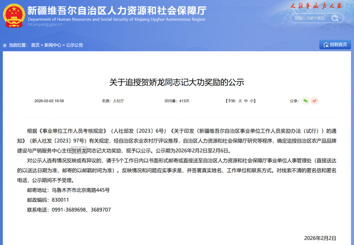 记者从新疆维吾尔自治区人力资源和社会保障厅获悉,自治区人社厅2日发布公示,确定追授已故新疆农产品品牌建设与产销服务中心主任贺娇龙同志记大功奖励。