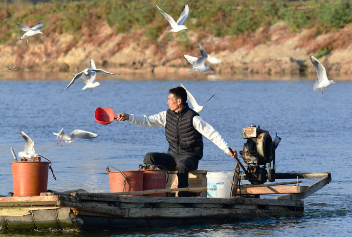 2025年12月10日,福建省漳州市佛昙镇东坂村河豚养殖户在给河豚投喂食物。新华社记者魏培全摄