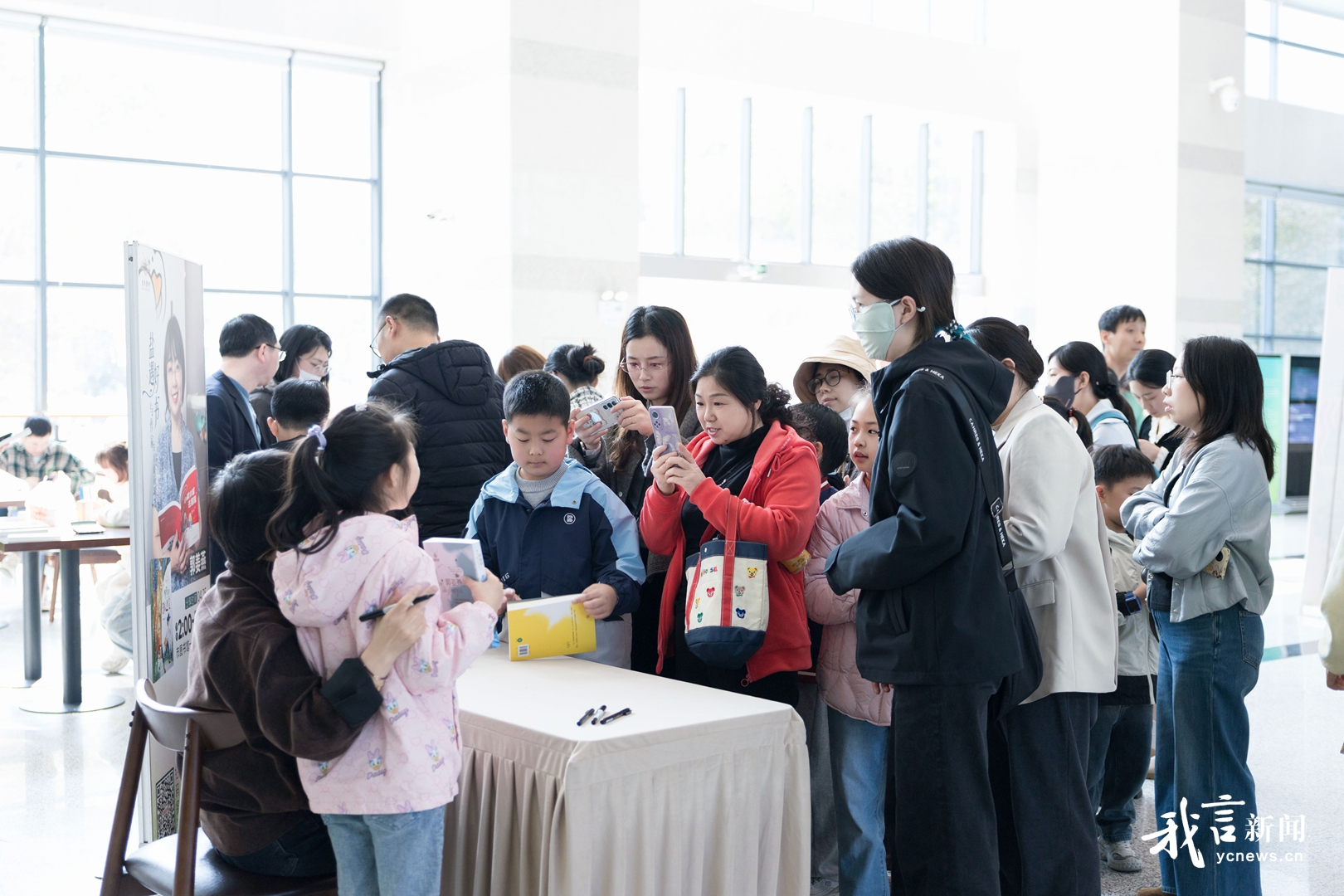 作为《布罗镇的邮递员》《南寨有溪流》等多部儿童文学名著的作者,作家郭姜燕用温暖细腻的笔触走进孩子们的心灵世界。她的读者见面会成了孩子们的专享时刻,台下小手举成一片,很多小朋友排着队上台提问。一位三年级男生站起来提问,“郭老师,我写作文总是写不长,怎么办?”郭姜燕耐心回应:“先别想着写长。把你最想告诉别人的故事,像放慢动作一样写下来,字自然就多了。”分享结束后,孩子们排起长队等待作者亲笔签名,翻书的哗啦声与欢快的童音在此刻交织成盐城春日最温暖的阅读乐章。